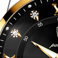- Caixa: Aço inoxidável com acabamento dourado, elegante e resistente.