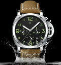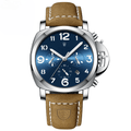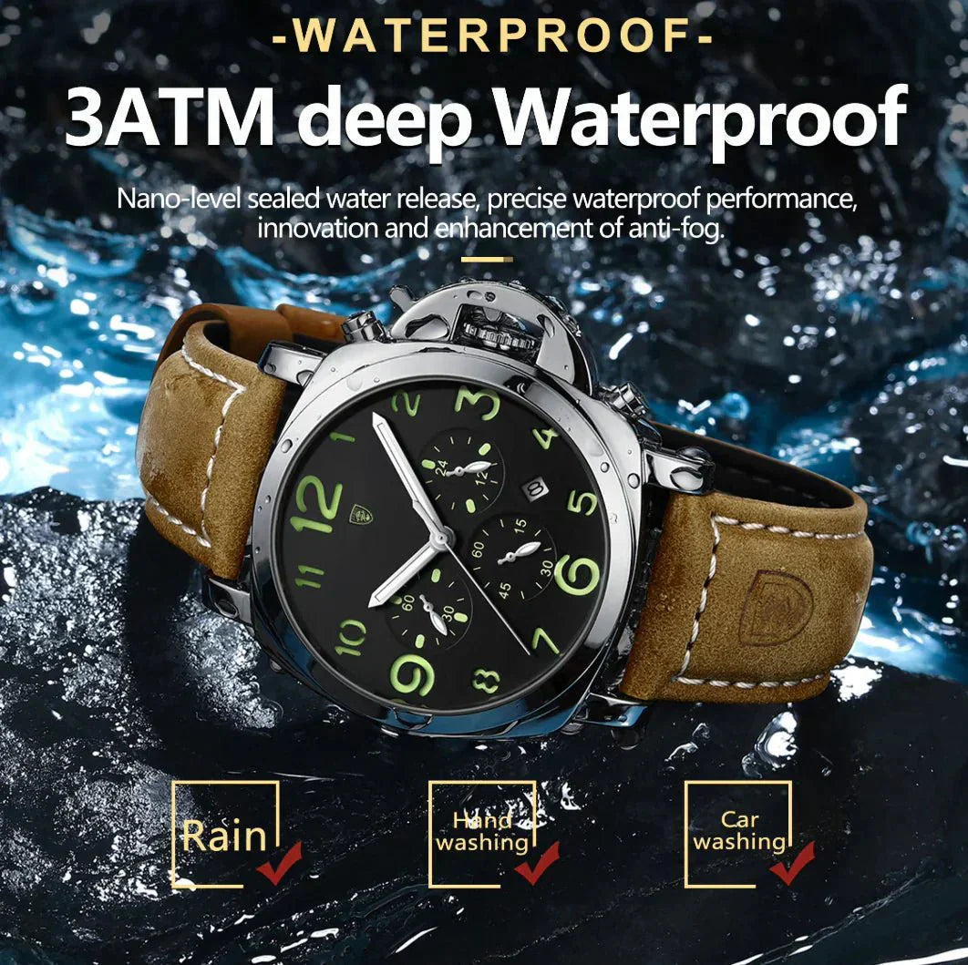 • Materials: Stainless Steel case, Leather strap, 3 Bar water resistance